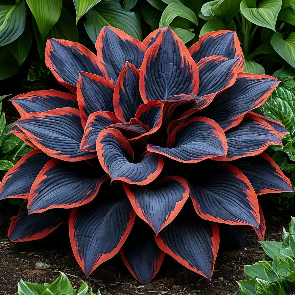 Хоста «Солнечный Агат» — это эффектное многолетнее растение, достигающее высоты около 40-60 см. Он формирует аккуратные кусты, которые выглядят особенно привлекательно в тени и полутени. У этого сорта большие, насыщенные зеленоватые листья с яркой черной окантовкой, а сами листья имеют характерную зубчатую форму. Такое сочетание цветов делает хосту «Солнечный Агат» поистине уникальной на фоне других растений, добавляя интересные акценты в ландшафтный дизайн.